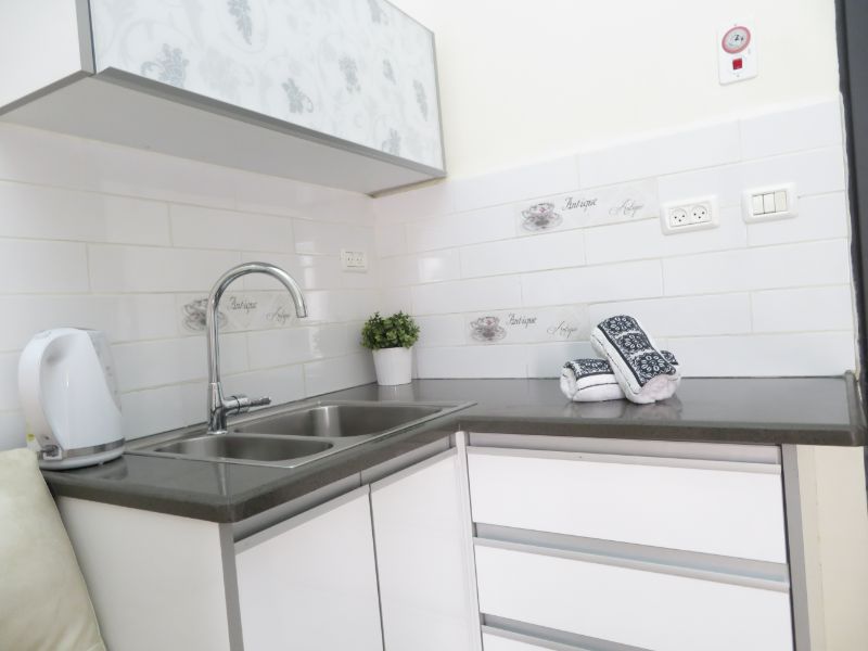 בהמשך מטבח מאובזר עם הרבה משטחי שיש, מקרר ענק, כירה חשמלית, מיקרוגל בשרי וחלבי.
