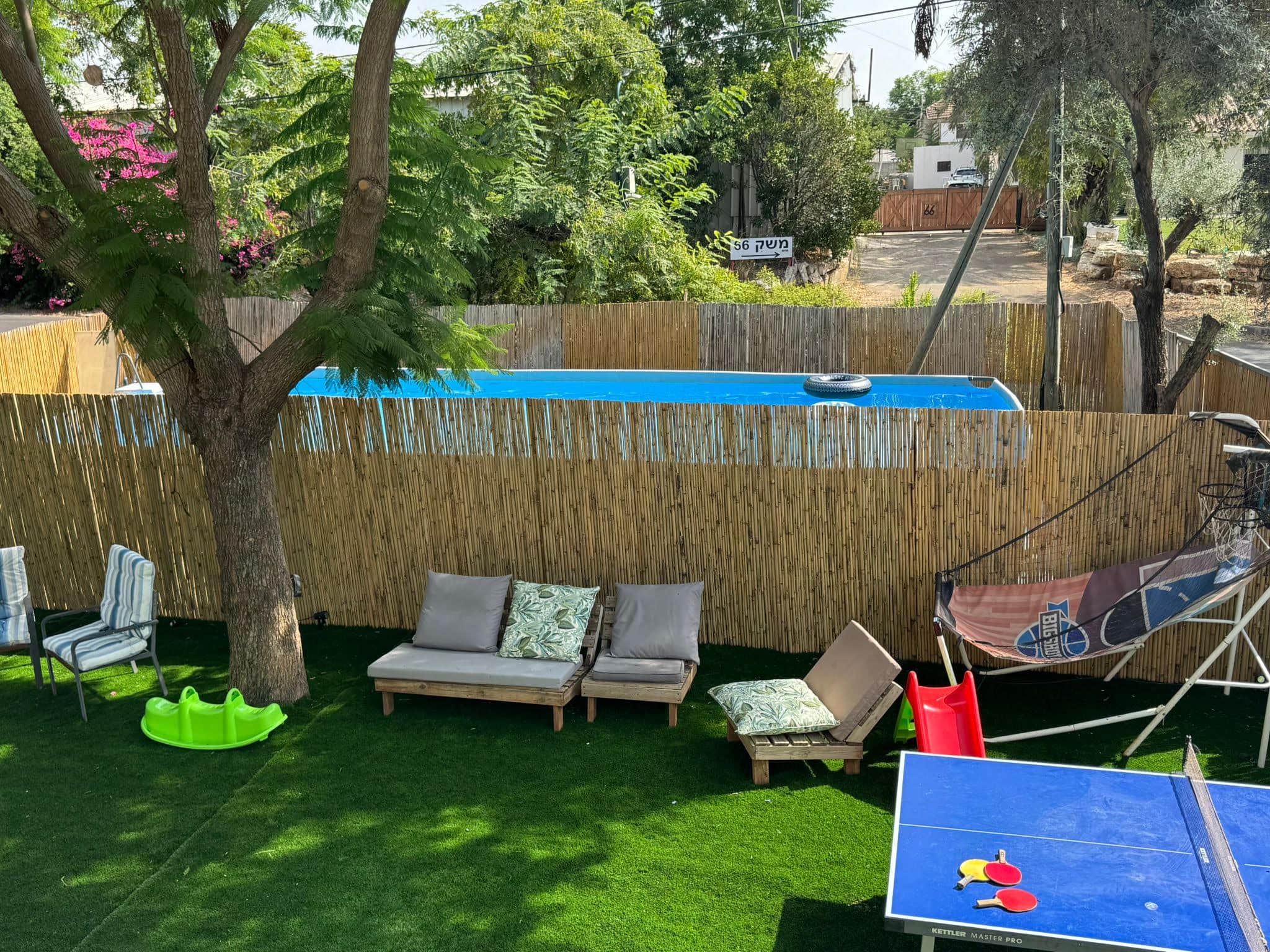 החצר המטופחת משתרעת על שטח של כ־200 מטרים וכוללת בריכה גדולה מגודרת, מדשאה לילדים, מתקני משחקים, שולחן פינג פונג, שולחן כדורגל וביליארד, ופינות ישיבה מוצלות. במרפסת המרווחת בגודל כ־25 מטרים מחכה לכם פינת מנגל מאובזרת ואווירה נעימה במיוחד לשעות בין הערביים.