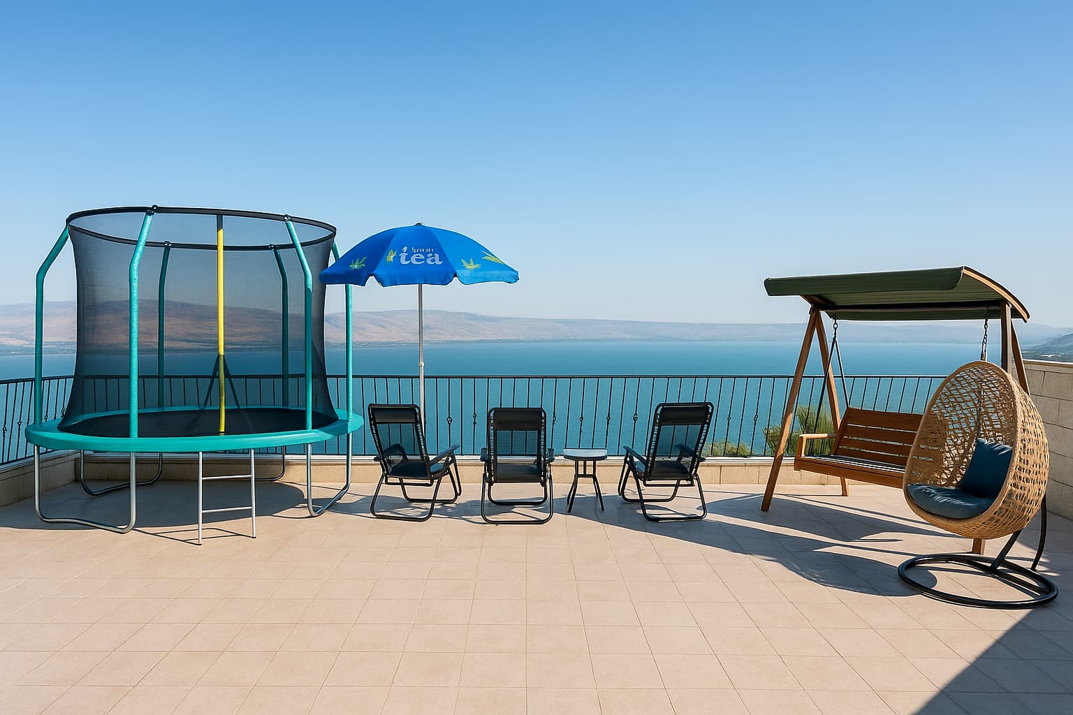 במרפסת ממתינים טרמפולינה גדולה עם טפטפות מים, נדנדה, ערסל, פינת ישיבה מסודרת, כיסאות שיזוף ומנגל, היוצרים מרחב חוץ נעים ומרווח שנועד להשלמת חוויית האירוח.