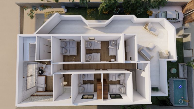 הווילה בנויה בשני מפלסים ומציעה תכנון מוקפד ונוח למשפחות גדולות או קבוצות. תשעה חדרי שינה זוגיים, חדר נוסף ליחיד, וחדר הורים מרווח במיוחד עם קיר חלונות פנורמי, מקלחת פרטית, פינת ישיבה נעימה ודלת כפולה לאווירה שקטה ומבודדת. בכל אחד מהחדרים ניתן להוסיף מיטות נוספות לפי הצורך, ובסלון מחכות מיטות נוחות לשינה רגועה ונעימה.