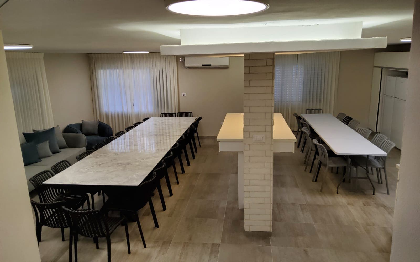 • 2 מקררים חדשים, בר מים חמים קרים, משטחי שיש גדולים, פינת אוכל 35 מקומות, פינת ישיבה נוחות, שירותים.