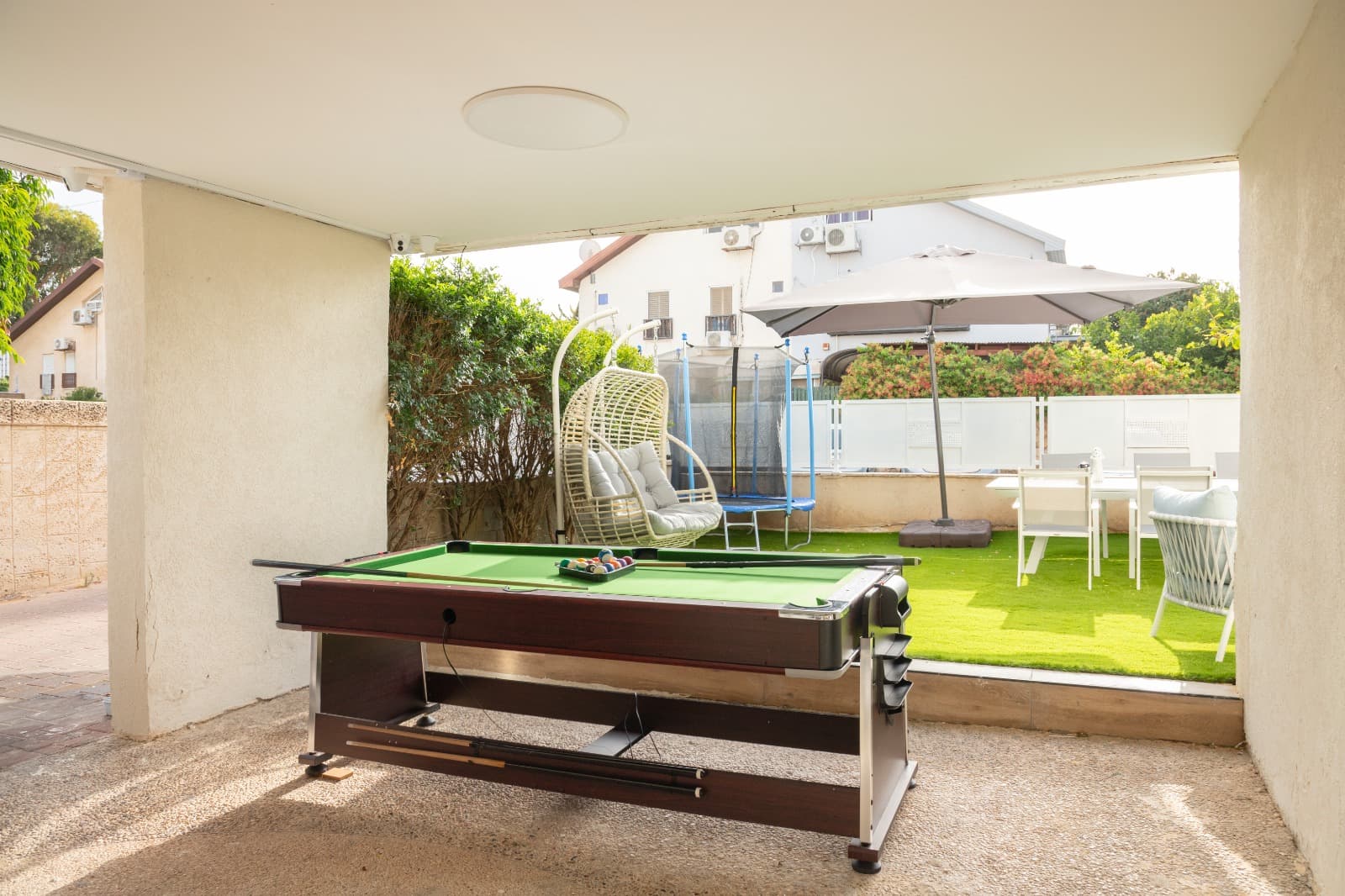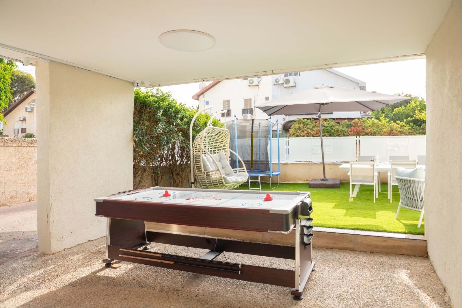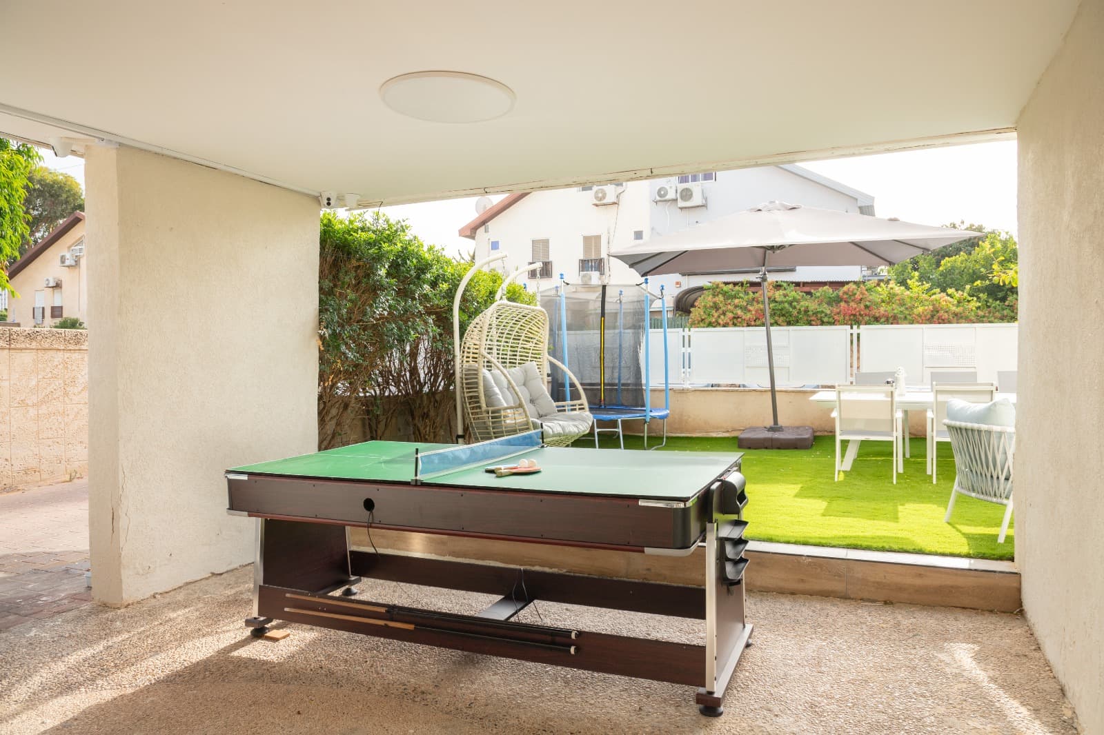 • חצר משותפת ענקית כוללת טרמפולינה לילדים, פינת ישיבה, פינת אוכל גדולה, משחקי שולחן, מטבח בחוץ, מנגל.
